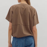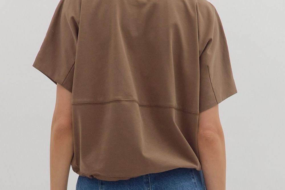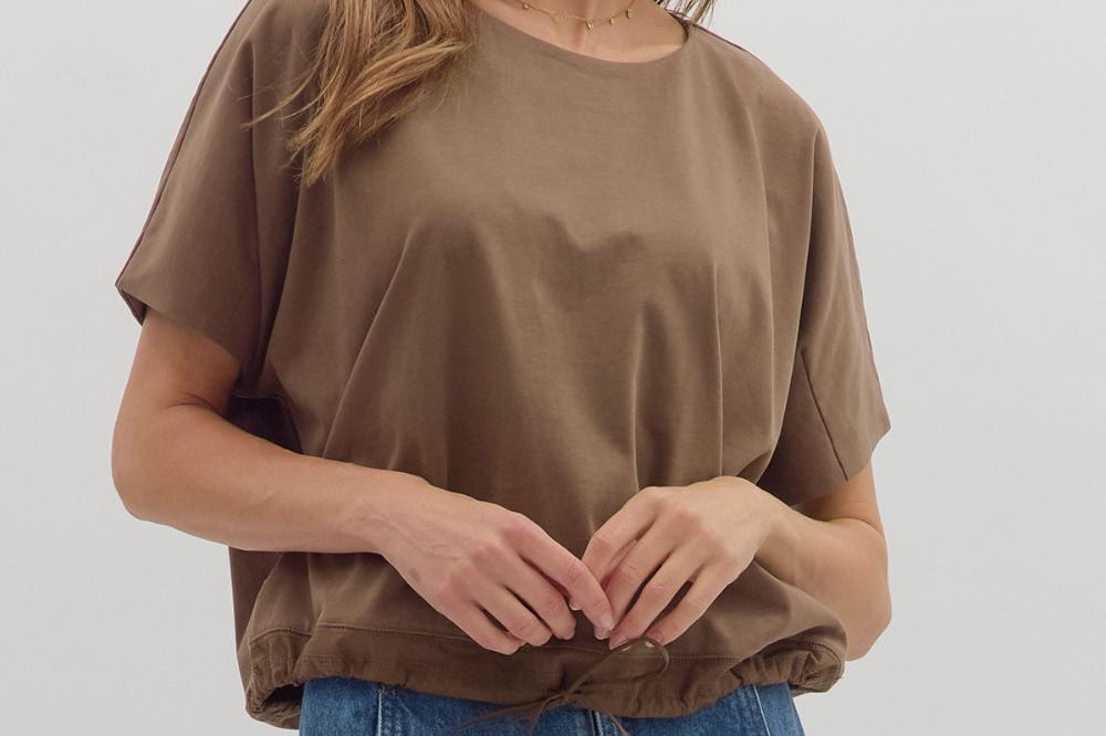 "Get ready to elevate your everyday look with our Brown Short Sleeve Round Neck Top! This black top features a fun adjustable drawstring hem and is made from lightweight, non-sheer knit fabric. With its unlined design and 100% cotton fabric, you'll stay comfortable while looking effortlessly stylish."