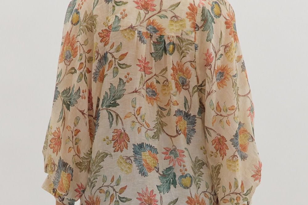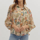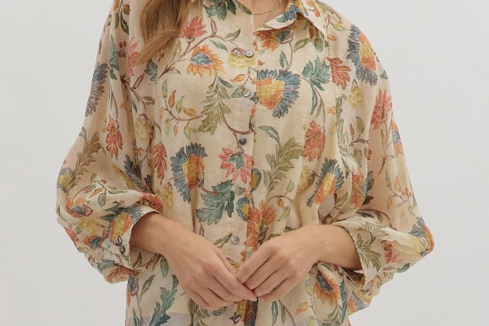"Add a touch of whimsy with our Floral Print 3/4 Sleeve Button-Down Top. The playful dropped shoulders and button closure at front make this top effortlessly trendy. Lined and lightweight, it's perfect for any occasion. Made with 75% TENCEL and 25% NYLON for ultimate comfort."