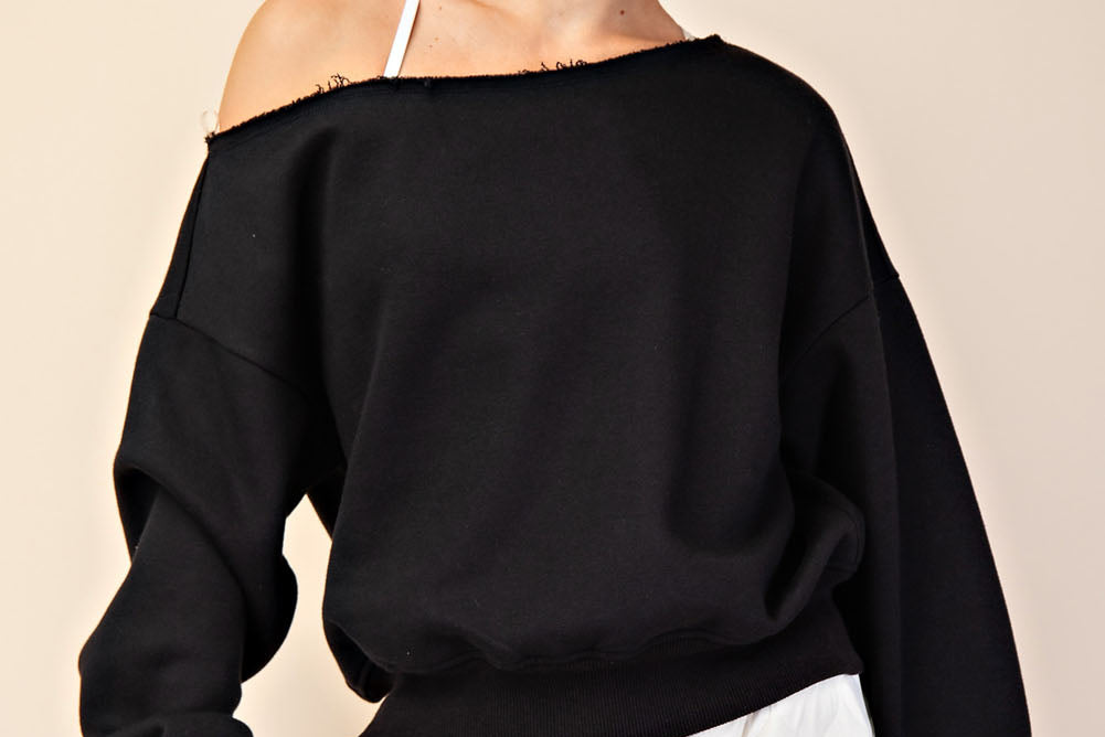 Unwind in luxurious comfort with our Black FRENCH TERRY FLEECE OFF SHOULDER SWEATSHIRT. Crafted from soft French terry fabric with a brushed interior, this top boasts a slouchy silhouette and stylish raw-edged asymmetrical neckline. Perfect for a casual chic look with a touch of effortless elegance.