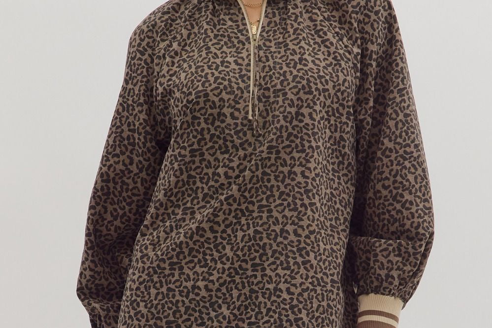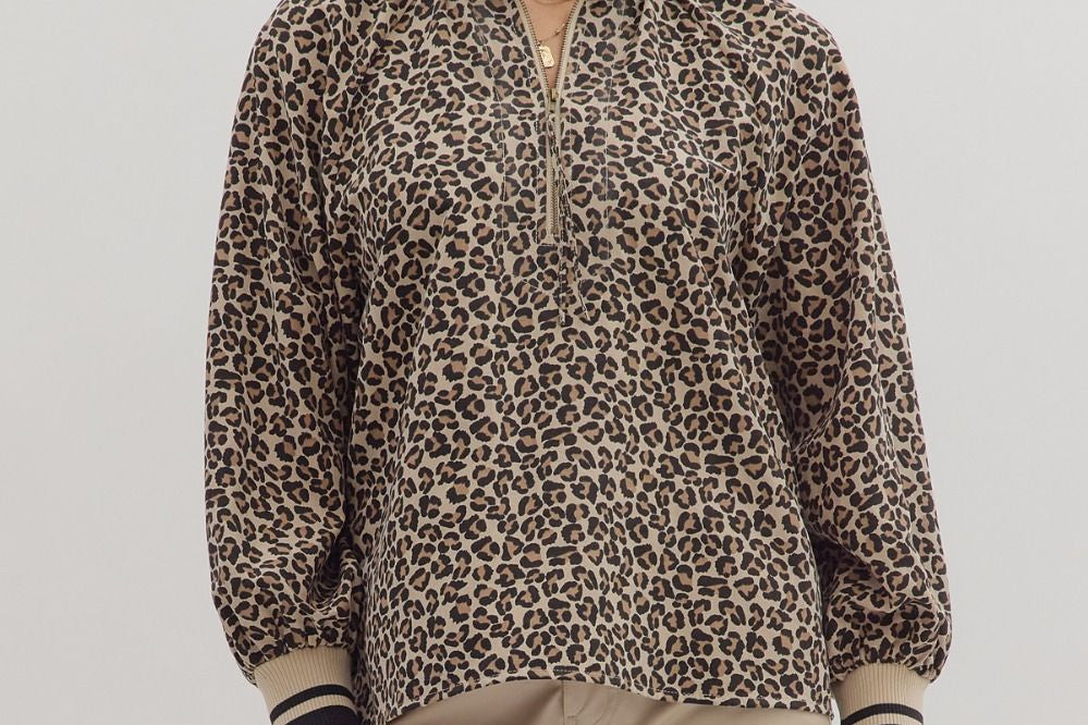 Step into the wild with our Leopard Print Long Sleeve! This top features a fierce leopard print, a zip-up mock neck, and zipper closure for a stylish touch. Designed with comfort in mind, it is unlined and made of medium weight fabric. Available in Taupe and Mocha, this top will add a fun and playful element to your wardrobe.