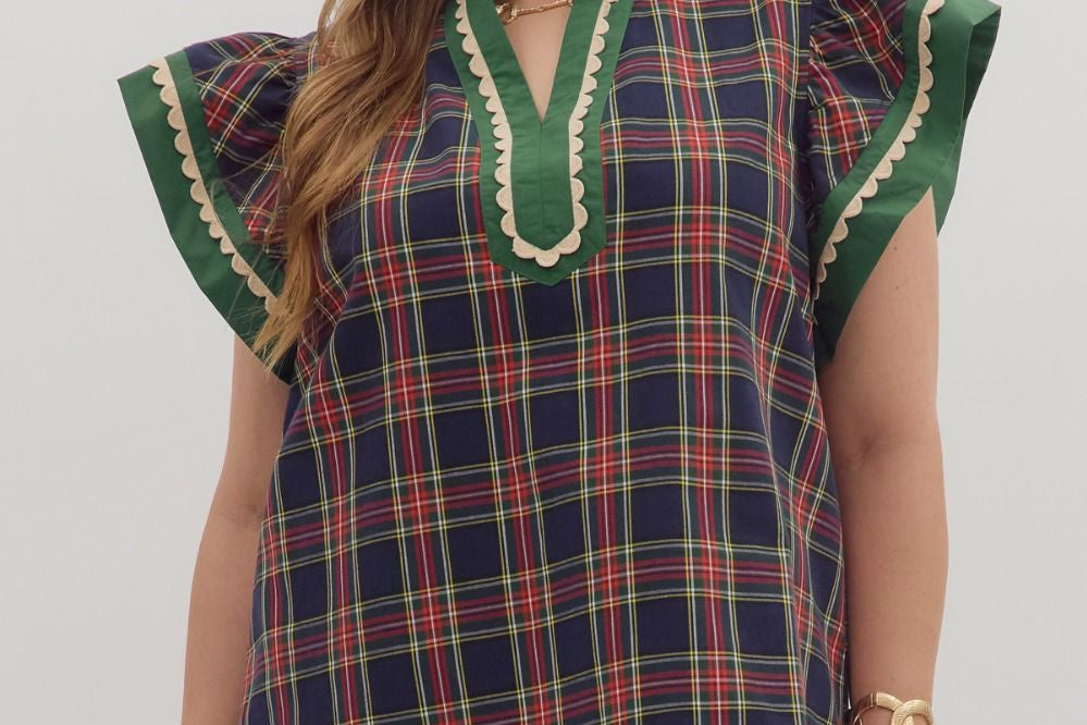 Plaid Pattern Scallop Trim Accent Flutter Sleeve Top