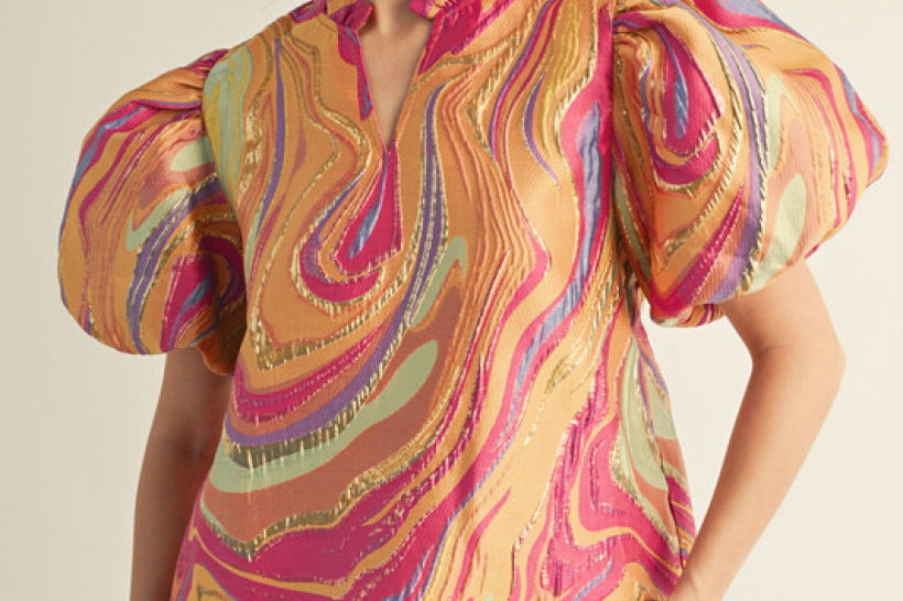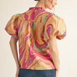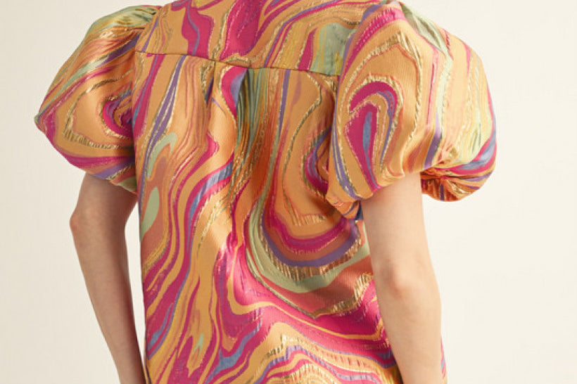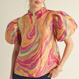 "Add some playful texture to your wardrobe with this short puff sleeve top. The abstract jacquard print and ruffled neckline make for a fun and unique look. Made from 100% polyester, this top is both comfortable and stylish. Perfect for standing out in a crowd!"