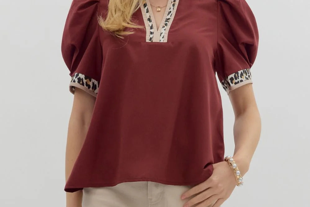 Get ready to turn heads with this pleated pullover top! The short voluminous sleeves add a unique touch to your outfit, while the accent V-neck band adds a touch of sophistication. Made with a lightweight and semi-sheer fabric, this top is perfect for any occasion.