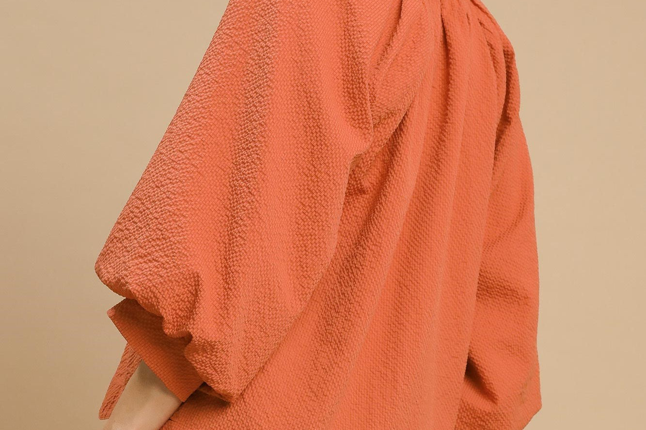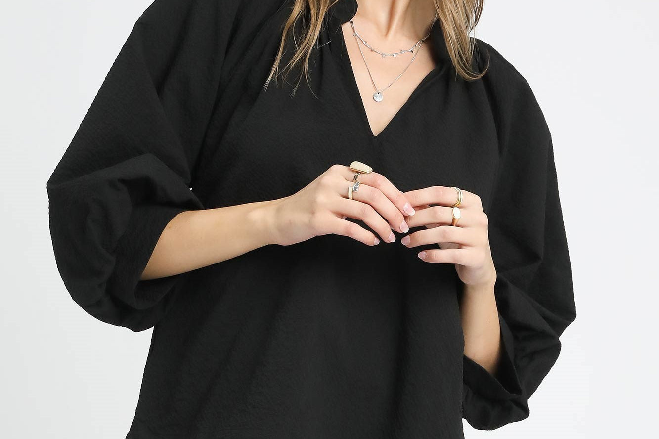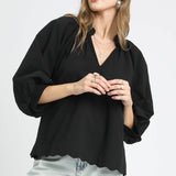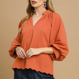 Experience the unique style and comfort of our Split V Neck Top with Balloon Sleeves. Made with textured fabric, this top provides a relaxed and flowy fit that flatters any figure. The V-neckline and 3/4 balloon sleeves add a touch of elegance, while the scalloped hemline adds a playful twist. Available in black or rust. 100% polyester.