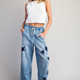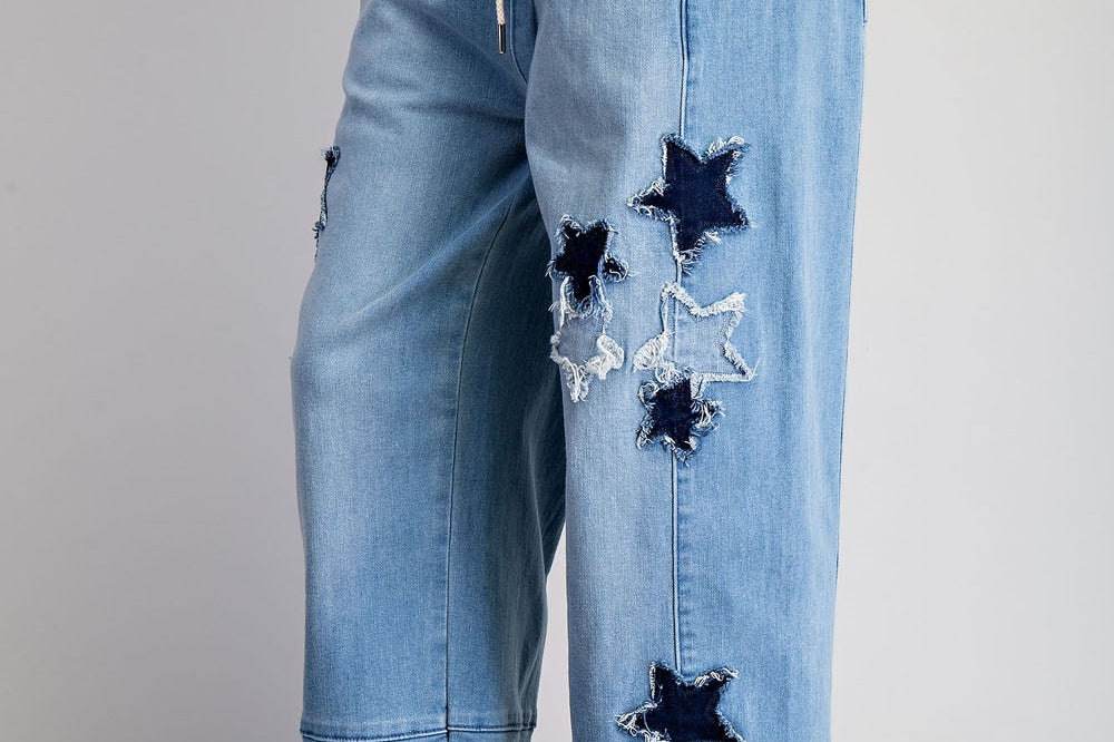 Get ready to strut your stuff in the Star Patch Straight Leg Denim Pants! These light wash wonders come with a comfy elastic waistband (no awkward pinching here) and a sassy star-shaped distressing that'll have you looking like a denimsation (denim sensation, get it?). Perfect for kicking back or showing off—pockets included for your secret snack stash!